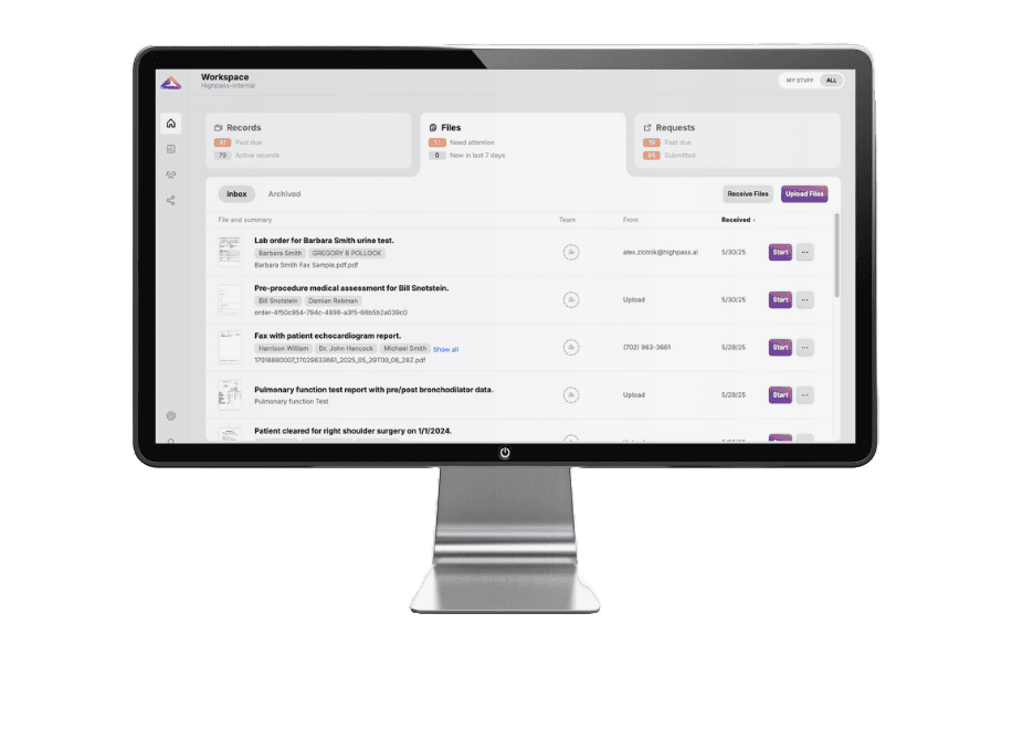 From inbox to insights, Highpass is your operational layer for real-time teamwork. Collaborate across roles and locations, assign actions, comment on files, and monitor record flow. Whether you’re clinical, admin, or exec, you see what you need, when you need it. And no one’s left out of the loop.